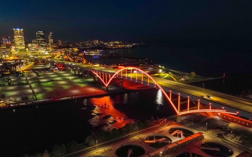 Milwaukee’s Daniel Hoan Memorial Bridge on Tuesday evening was lit up bright orange to remind drivers to slow down during the busy road construction season.